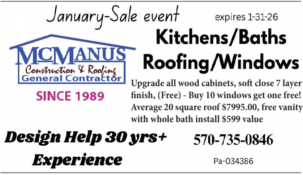 Jan 09, 2026. McManus Construction & Roofing Construction Ads from Wilkes Barre Services